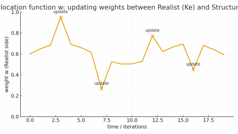 - 配分関数 w の模式図:場面ごとに w(実在=仮の重み)を更新し、1−w を構造=空に割り当てる。外乱や誤差の検知で“update”が入る。